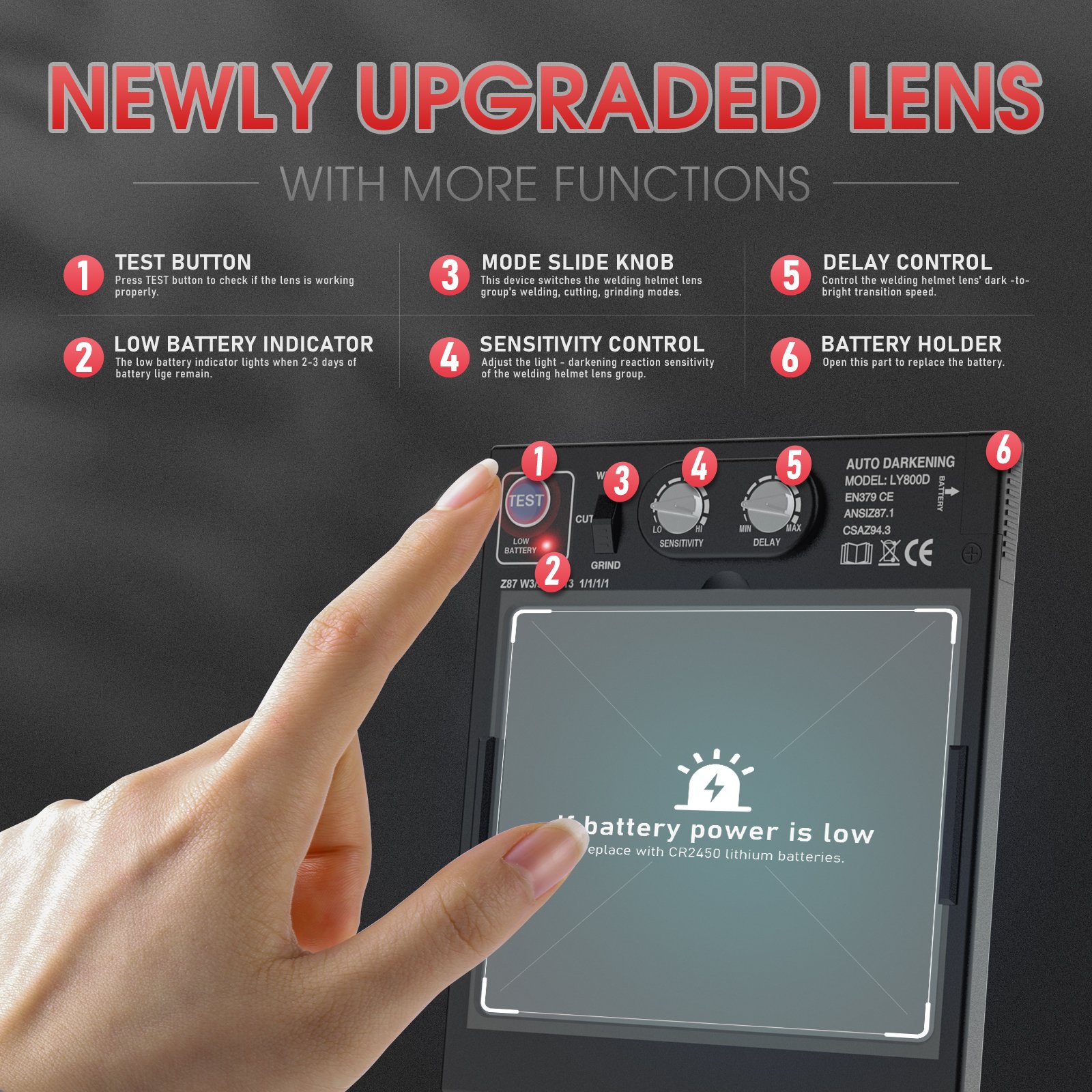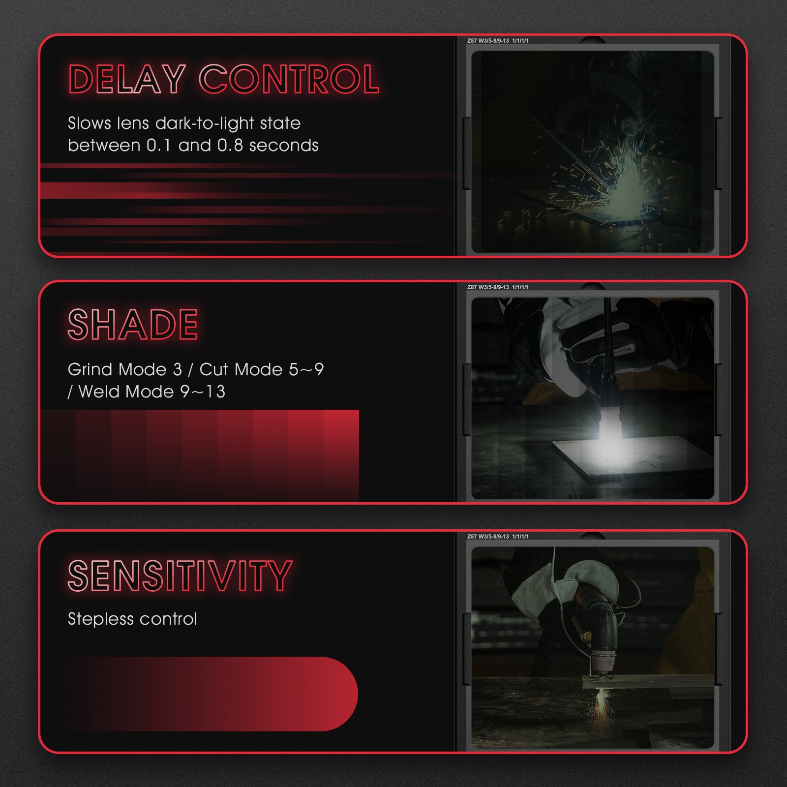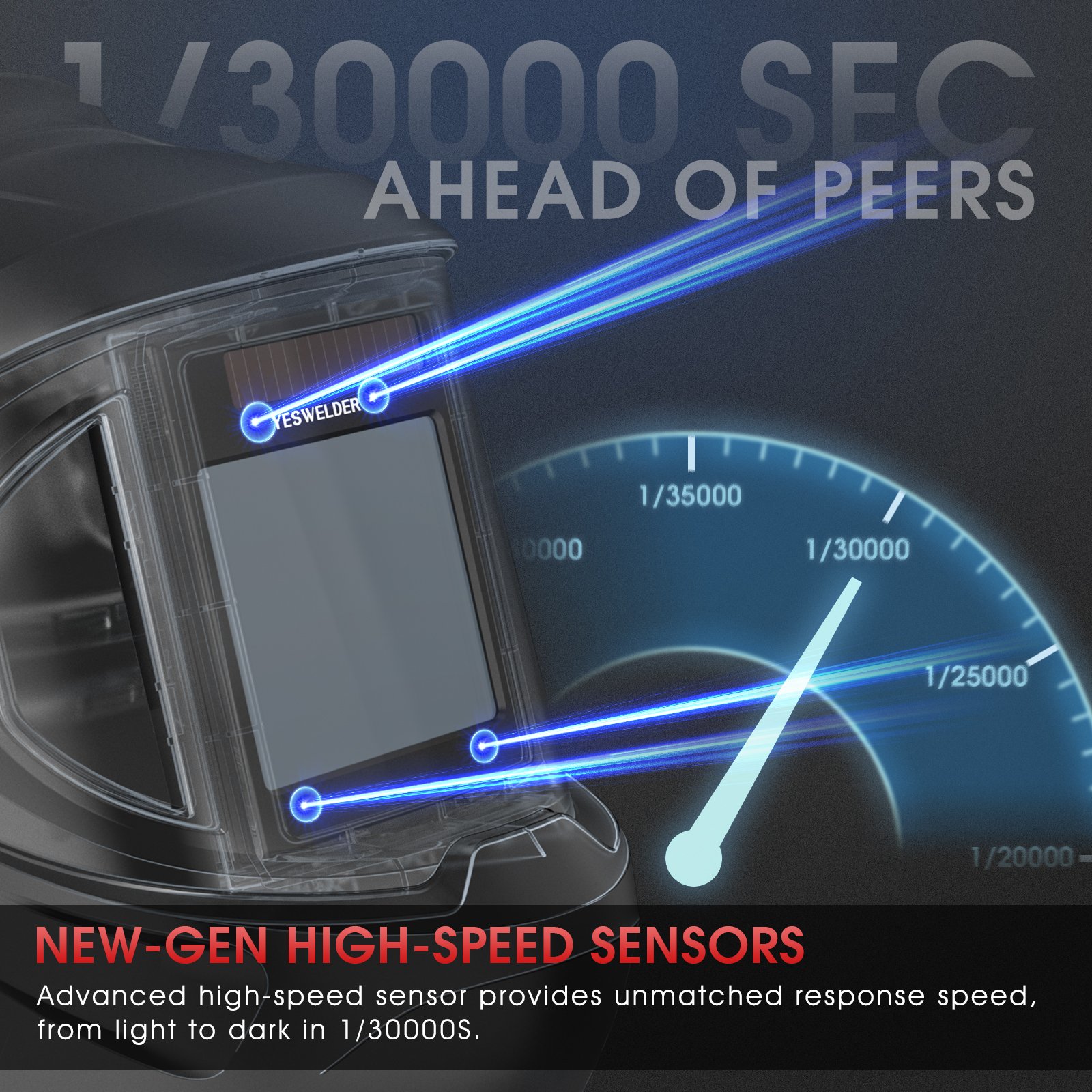 The helmet features a state-of-the-art auto-darkening filter equipped with 4 Arc Sensors. This ensures reliable detection with an ultra-fast switching speed of 1/30,000 seconds, protecting your eyes from harmful light flashes. Additionally, adjustable sensitivity and delay controls allow for a customized experience, making it suitable for a wide range of environments and welding setups.