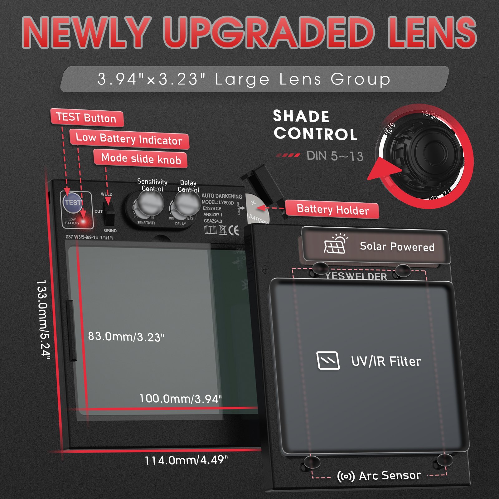 The welding hood features an expansive 3.94″ x 3.23″ main viewing area, complemented by Side View panels (DIN5, non-auto-darkening) for enhanced situational awareness. Enjoy the benefits of 1/1/1/1 optical clarity lenses, delivering True Color technology to reduce eye strain and improve visibility. Whether tackling intricate welds or surveying your workspace, the large viewing window ensures optimal precision.